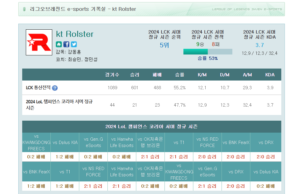 - 2024 LCK 성적: 스프링 6위