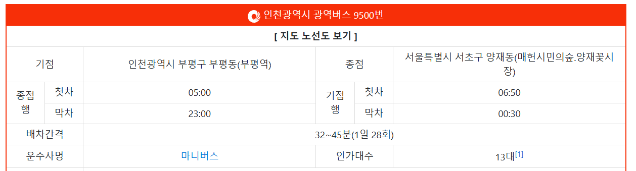 9500번 광역버스는 부평에서 강남, 양재까지 빠르게 이동할 수 있는 주요 노선으로, 출퇴근 시간대에 특히 많은 승객이 이용합니다. 효율적인 이용을 위해 정류장 위치, 시간대별 요금, 첫차·막차 시간, 환승 가능한 지하철역 정보를 정리했습니다.