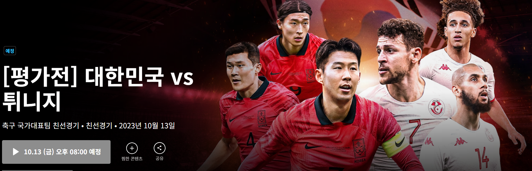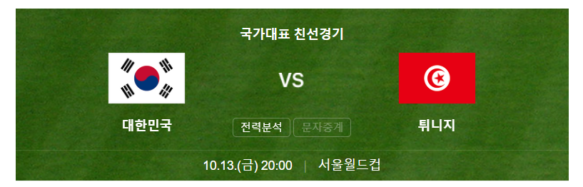 10월 13일 금요일 저녁 8시 서울 월드컵 경기장에서 치뤄질 친선 경기에 우리 한국 팀은 FIFA랭킹으로는 29위인 튀니지에 26위로 근소하게 앞서있지만 역대전적에서 한국이 1 무 1패로 열세입니다.