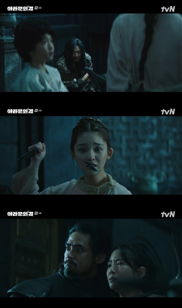 14일밤 방송된 아라문의 검 9화에서는 사야의 죽음에 의문을 품는 탄야와 태알하.