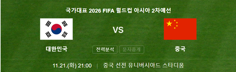 중국과의 경기는 11월 21일 화요일 저녁 9시 중국 선전 유니버시아드 스타디움에서 열립니다.