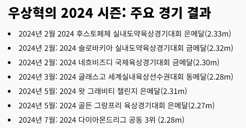 우상혁 선수는 도쿄 올림픽 이후 각종 국제 대회에서 꾸준한 성장세를 보이며, 다이아몬드 리그 파이널 우승, 오리건 높이뛰기 우승 등 화려한 성적을 거두었습니다.