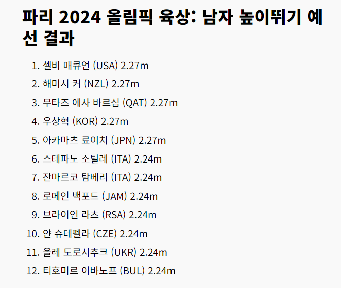 이번 파리올림픽 남자 높이뛰기 예선에서 2m 27을 넘은 선수는 총 5명이었으며, 우상혁 선수는 그중 한 명으로 공동 3위를 기록했습니다.