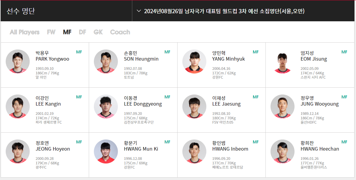 ▶MF : 박용우(알아인, UAE), 정우영(울산 HD), 황인범(즈베즈다, 세르비아), 이재성(마인츠, 독일), 손흥민(토트넘, 잉글랜드), 황희찬(울버햄튼, 잉글랜드), 이동경(김천상무), 정호연(광주 FC), 양민혁(강원 FC), 엄지성(스완지시티, 잉글랜드), 이강인(파리생제르맹, 프랑스)