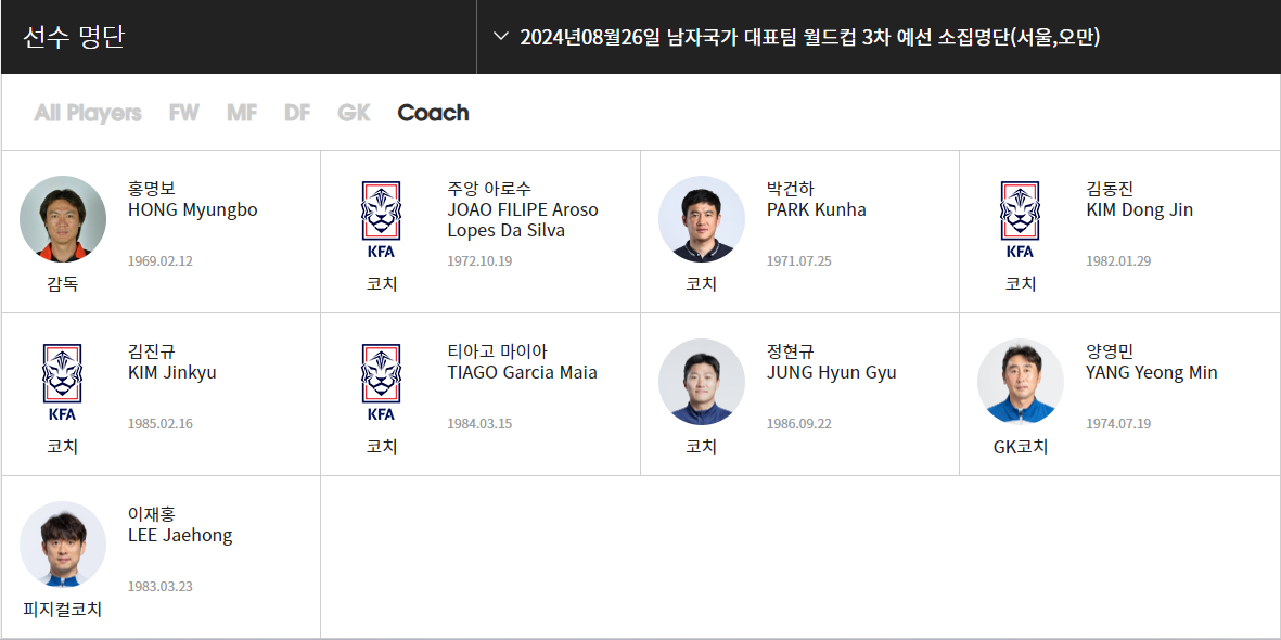 대표팀 출전 선수 명단