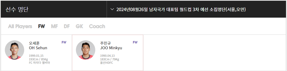 ▶FW : 주민규(울산 HD), 오세훈(마치다젤비아, 일본)