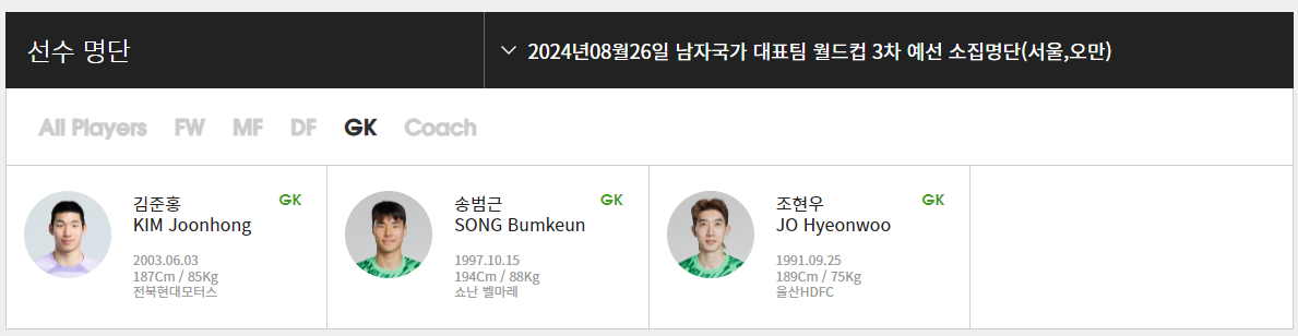 ▶GK : 조현우(울산 HD), 송범근(쇼난벨마레, 일본), 김준홍(전북현대)