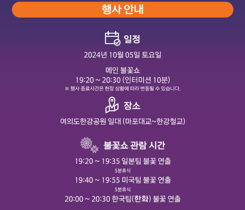 ✅일정: 2024년 서울세계불꽃축제는 10월 5일(토)에 여의도 한강공원에서 개최됩니다.