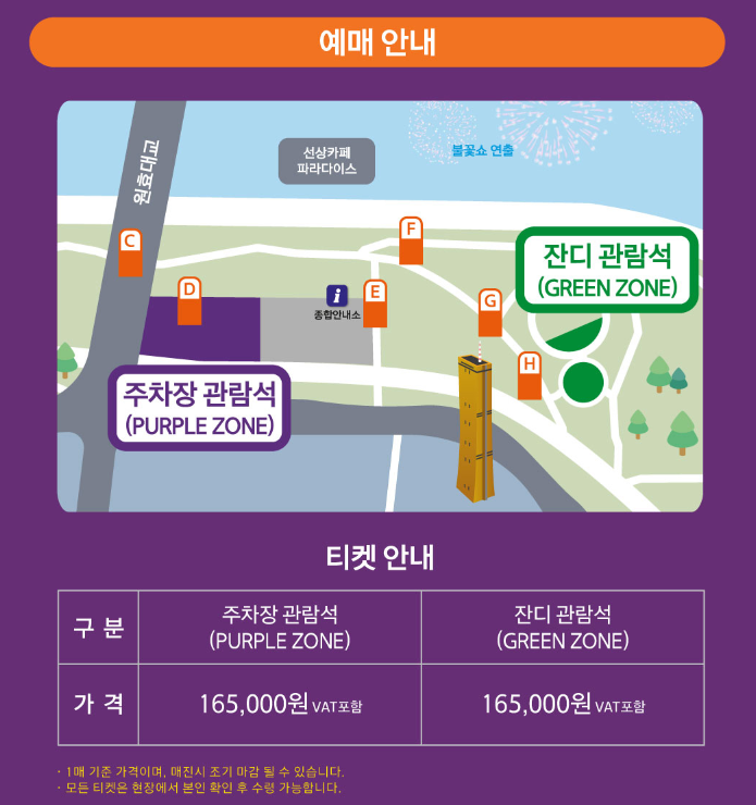 ✅유료 좌석: 주차장 관람석과 잔디 관람석이 있으며, 가격은 각각 165,000원입니다. 이 좌석들은 사전 예약제로 운영되며, 매진 시 조기 마감될 수 있습니다.