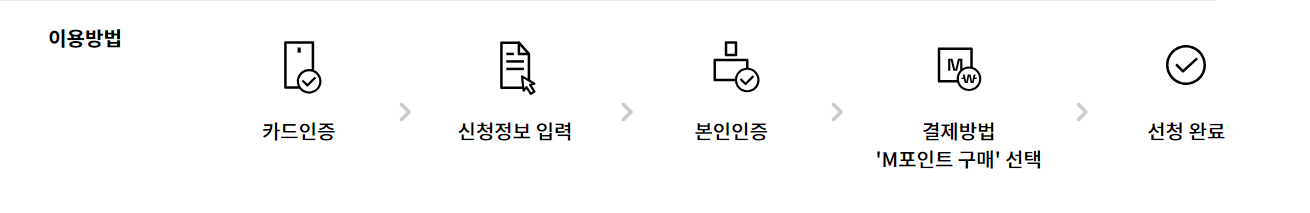 - M포인트 적립이나 사용가능한 모든 카드 이용할 수 있습니다. 단, 법인, 체크, 선불, Gift카드, 하이브리드카드 제외입니다.
